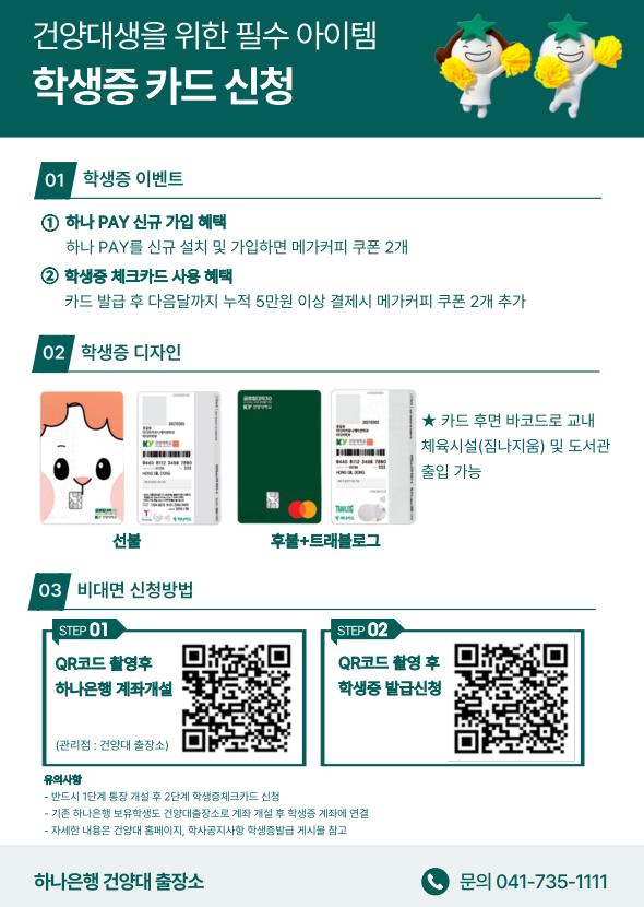 *1단계계좌개설바로가기 https://m.hanabank.com/cont/mybranch/1517/03/MYB15170130372/index.html *2단계학생증발급신청바로가기 https://m.hanabank.com/cont/mybranch/1517/03/MYB15170130394/index.html *학생증디자인 첨부파일 참고 - 선불선택시 캐릭터디자인/후불선택시 초록색디자인발급* □ 학생증 교부기간 : 2026. 3월 중순 이후 카드 수령 카톡 안내 △ 논산 창의융합 캠퍼스 : 하나은행 건양대출장소 (건양회관 2층) 교부 △ 대전 메디컬 캠퍼스 : 하나은행 건양대병원출장소(건양프라자 2층) 교부 □ 유의사항 △ 휴대폰이 본인 명의가 아니거나 20영업일 이내 비대면으로 개설한 계좌가 있는 경우(타은행 포함) 비대면 계좌개설 신청이 불가하며 발급기간 중 하나은행 건양대 출장소, 건양대병원 출장소 내점하여 신청 가능 △ 학생증 사진은 증명사진 또는 저장된 파일 업로드 가능(JPG파일만 가능), 증명사진 촬영은 사진의 바탕색보다 짙은 배경에서 가로방향으로 촬영 □ 카드발급 상담문의 △ 하나은행 건양대출장소 : 041-735-1111 (상담시간 9:00~17:00) △ 하나은행 콜센터 : 1599-2111(계좌개설문의), 1800-1111(계좌개설후 카드신청단계문의)