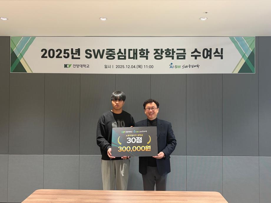 건양대학교 소프트웨어중심대학사업단, “2025년 SW중심대학 장학금 수여식”개최 2025년 장학금 1억 3천여만 원 지원… AI·SW 인재양성 본격 가속 건양대학교(총장 김용하) 소프트웨어중심대학사업단(단장 겸 AI·SW융합대학장 김용석)은 12월 4일“2025년 SW중심대학 장학금 수여식”에서 AI·SW융합대학 재학생과 신입생을 대상으로 ‘신입생 장학금’과 ‘소중마일리지 장학금’ 1억 3천여만 원을 지급하며, AI·SW 인재양성을 위한 실질적인 재정 지원을 강화하고 있다고 밝혔다. 사업단은 2025학년도 AI·SW융합대학 신입생 전원에게 1인당 100만 원씩 장학금을 지급했다. 이 장학금은 신입생의 조기 학습 동기 유발, 데이터 기반 실무역량 기초 형성, AI·SW 학습 생태계 조기 적응을 목표로 마련되었으며, 2026학년도 신입생에게도 동일한 규모의 장학금 지급을 이어갈 계획이다. 또한 사업단은 소중마일리지 장학금 제도를 통해 재학생의 비교과 활동과 실무역량 성장을 동시에 장려하고 있다. 소중마일리지는 학생이 참여한 AI·SW 교육 프로그램, 자격증 취득, 공모전, 산학 프로젝트, 클라우드·AI 실습 등 다양한 활동을 점수화해 장학금으로 환산하는 제도로, 총 47명의 학생에게 누적 마일리지 1.700여점에 해당하는 장학금이 지급됐다. 이번 2차 수여식은 학기별 활동성과를 공유하고 학생 참여 분위기를 확산한다는 점에서 의미가 크며, 사업단은 학기마다 학생 참여도를 고려해 장학금 지급을 지속할 예정이다. 이처럼 신입생 장학금과 소중마일리지 장학금을 합산하면 2025년 한 해 동안 약 1억 3천여만 원 규모의 장학금이 학생들에게 지원되며, 소프트웨어중심대학사업단은 전공·비전공 학생의 균등한 AI·SW 역량 성장을 적극 유도하고 있다. 소중마일리지 제도는 AX-SQUARE 플랫폼을 기반으로 학습·활동 데이터를 자동 관리하여 학생의 실습 성과뿐 아니라 활동 난이도와 기여도까지 반영하는 것이 특징이다. 이를 통해 학생은 자신의 역량 성장 이력을 데이터 기반으로 확인할 수 있고, 대학은 성과 중심의 SW교육을 체계적으로 운영할 수 있다. 교육 프로그램 역시 AWS·네이버 클라우드 협력 교육, XR·로봇 실습, 클라우드 실무 부트캠프, AI 창업캠프 등 실무교육 중심으로 확대 운영 중이며, 사업단은 이러한 프로그램을 마일리지 체계와 유기적으로 연계해 학생 참여를 활성화하고 있다. 김용석 단장은 “소프트웨어중심대학사업단의 장학금은 단순한 지원이 아니라, 학생이 스스로 역량을 키우고 실제 성과를 경험하도록 돕는 ‘미래에 대한 투자’다”라며 “신입생에게는 AI·SW 학습을 시작할 수 있는 안정적 기반을 제공하고, 재학생에게는 활동과 성과가 정당하게 보상받는 환경을 만들어 더 많은 학생이 SW역량을 갖춘 경쟁력 있는 인재로 성장하도록 교육·지원 체계를 지속적으로 강화하겠다”고 밝혔다.